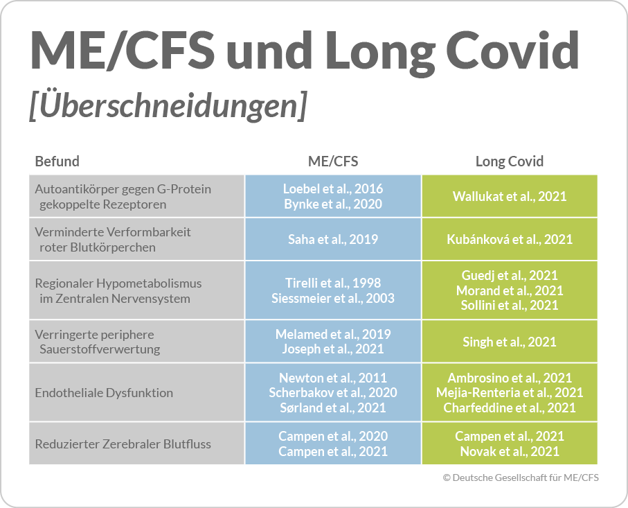 Einige Befunde waren schon für ME/CFS nachgewiesen, bevor sie im Pandemie-Jahr 2021 für Long Covid ebenfalls gezeigt wurden. © Deutsche Gesellschaft für ME/CFSDie Studienlage zu ME/CFS vor der Pandemie war prekär, zum Teil ist sie es noch. Eine Studie aus den USA stellte fest, dass ME/CFS gemessen an der Krankheitslast bei weitem die wenigsten Forschungsgelder bekommt. Dies steht in starkem Ungleichgewicht zu den hohen sozioökonomischen Kosten, die durch sie verursacht werden. Da jedoch Post-Covid und ME/CFS frappierende organische Gemeinsamkeiten aufweisen und Covid-19 als der häufigste Trigger für ME/CFS gilt, scheint sich die Lage derzeit zu ändern. Inzwischen wird ME/CFS als die schwerste Folge der Covid-Infektion wahrgenommen. An der Berliner Charité und an der TU München forschen Prof. Dr. Carmen Scheibenbogen und Prof. Dr. Uta Behrends bereits seit Jahren zu ME/CFS. Nun hat das Bundesministerium eine Nationale Klinische Studiengruppe (NKSG) aus acht Projekten mit 10 Millionen Euro sowie ein Verbund aus fünf Projekten (IMMME, Immune Mechanisms of ME) mit 2,1 Millionen Euro gefördert. Ziel: Aufklärung der Krankheitsmechanismen, die der ME/CFS zugrunde liegen und Entwicklung von Medikamenten. Scheibenbogen forscht beispielsweise zu Autoantikörpern, die bei 30 Prozent der Erkrankten erhöht sind. Diese Autoantikörper binden an körpereigene Rezeptoren und stören so deren Signalübertragung. Einer der Rezeptoren ist für die Gefäßerweiterung wichtig und damit für die Blutzirkulation, die bei ME/CFS-Patienten nachweislich gestört ist. Damit lassen sich viele Symptome erklären. Mit einer experimentellen Immunadsorption, bei der die Autoantikörper blockiert oder entfernt werden, hat die Professorin schon gute Ergebnisse erzielt. Scheibenbogen geht davon aus, dass die Krankheit gut behandelbar sein wird, da keine Organe geschädigt sind, sondern eine Funktionsstörung vorliegt. Ob die Autoantikörper oder andere Mechanismen ursächlich bei der Erkrankung eine Rolle spielen, müssen weitere Studien zeigen.
